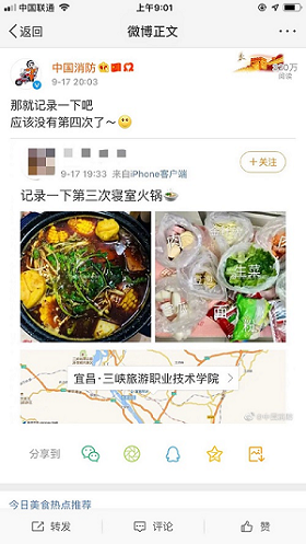 “记录一下第三次寝室火锅”,9月17日19时33分,一名网友发微博“炫耀”在寝室吃火锅,并附上两张图片,还“嘚瑟”地标注了吃火锅的地点:三峡旅游职业技术学院。